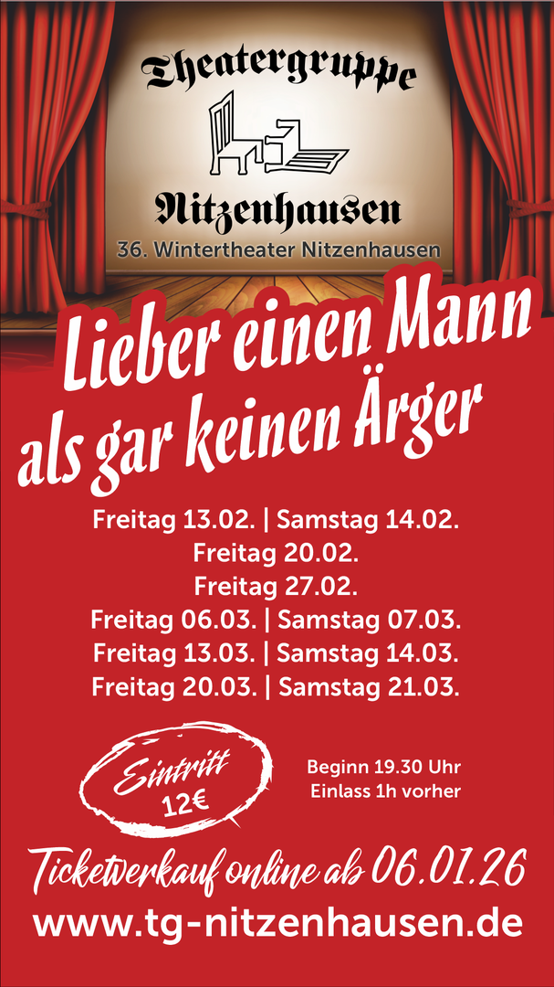 Zwischen Januar und März biegen sich während der Theaterzeit die Bretter, die die Welt bedeuten und mit ihnen nicht zuletzt auch das Publikum. Zwischen derben Sprüchen, Verwechslungsgeschichten und großen Gefühlen ist alles dabei und wird in bekannt nitzenhäuserischer Theaterart auf die Bühne gebracht.